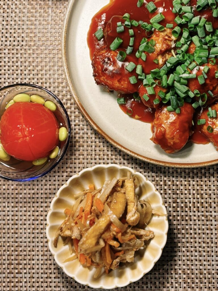 ごぼう入り肉団子の甘酢あんかけはごぼうの風味がしっかり効いてて、食べ応えもばっちりです。おべんとうのおかずとかにもいいかもしれませんね~