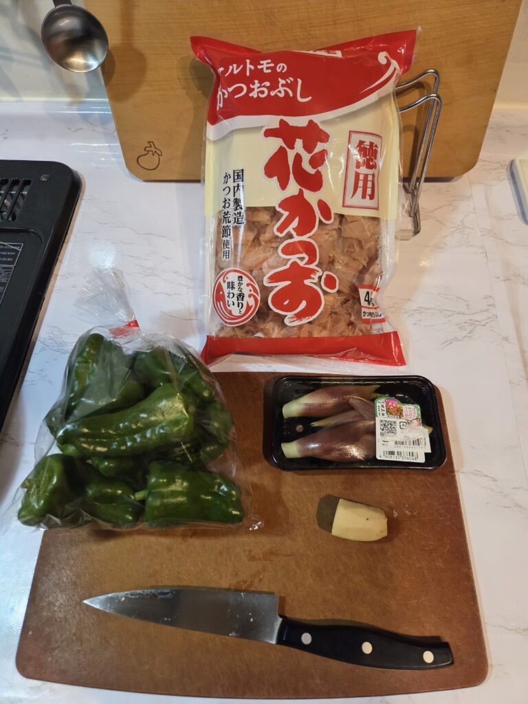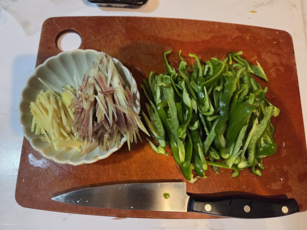 ピーマンは青椒肉絲に入っているものくらいの細さ、生姜とみょうがはできる限り細く切る。