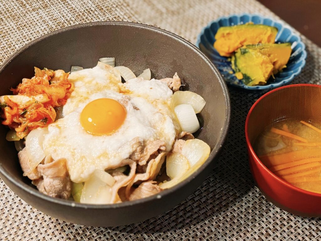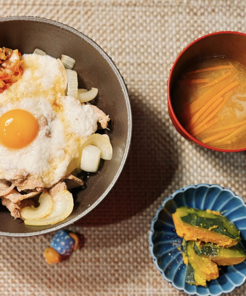 前日のとろろの余りを牛丼にかけてとろたま牛丼です。牛丼の頭は意外と簡単にすぐ作れます。