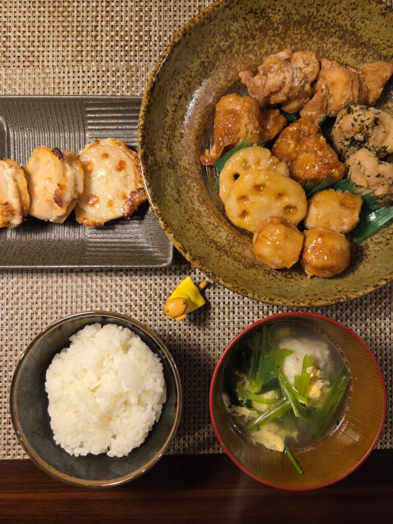 鶏つくねは鶏むね肉と水気をしっかり切ったおろし玉ねぎを小麦粉をツナギにして作るともっちりふわふわなつくねになります。