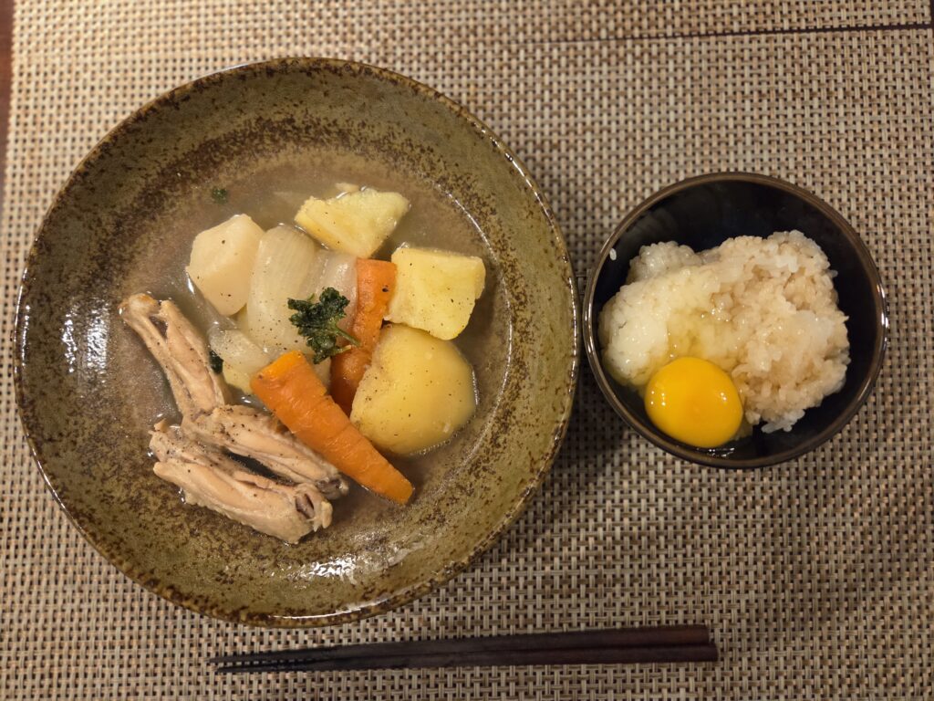 皮からも野菜出汁を取り、動物性の旨味は骨付き肉を使い、香りはパセリとブラックペッパーでつける。味付けは塩のみで化学調味料は使ってません。