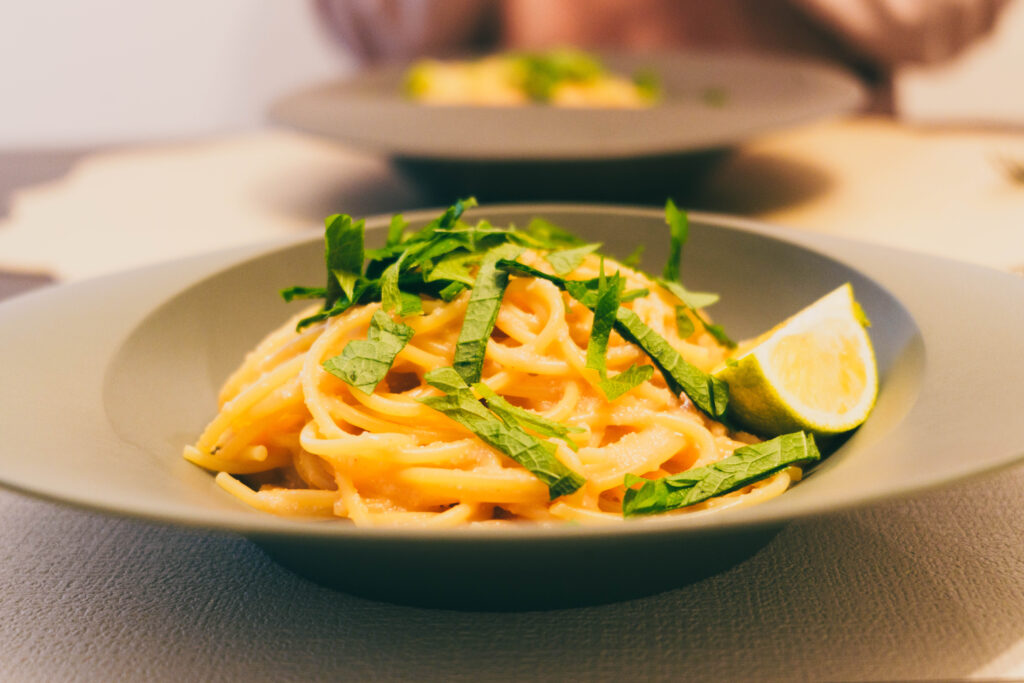 そのうち明太子を贅沢に使って作った明太バターパスタです。大葉やすだちを添えて味変するとさっぱりといただけます。