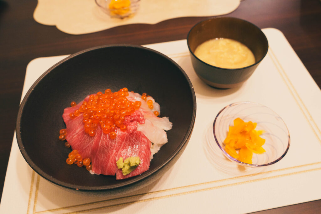 娘の離乳食用の鯛のあまりと親からの救援物資のマグロ(デパートの美味しいやつ)とふるさと納税のいくらでつくった海鮮丼です。