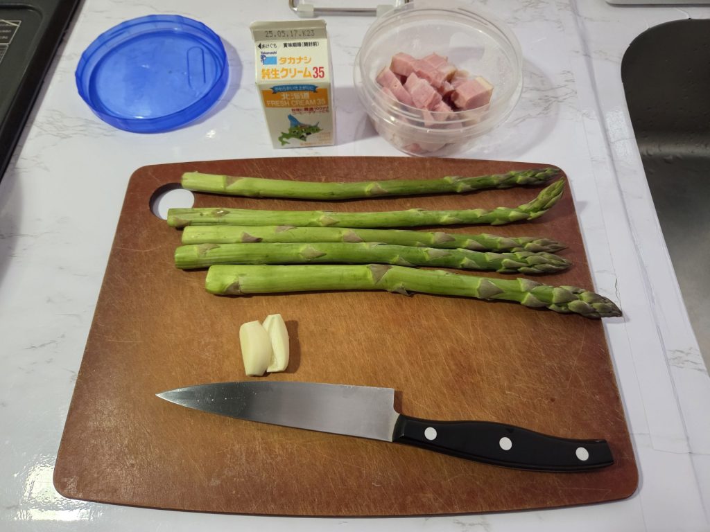 今回は家にあったのでアスパラで作っていますが具になる材料は別のものでもいいと思います。ただ、ベーコンは肉の旨味が出るのでできればあった方がいいです。ホタテクリームやサーモンクリームのパスタを作るなら無くてOKです。