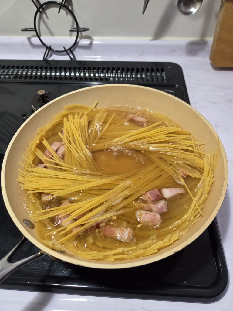 ベーコンとニンニクを炒めたフライパンにそのまま水、塩、コンソメを入れ、沸騰するまで加熱していきます。沸騰したら弱めの中火くらいに火を落としてください。火力が強すぎると水分がガンガン飛んでゆであがる前に干からびてしまいます。