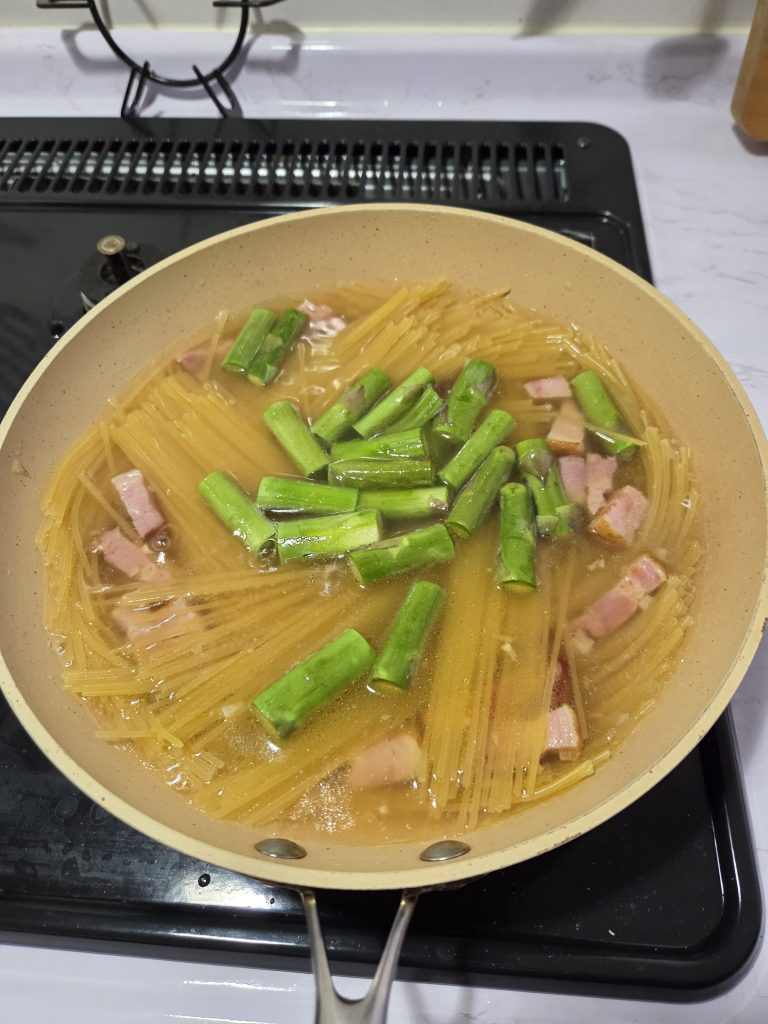水が沸騰したらパスタとアスパラの根元に近いほうを湯がいていきます。