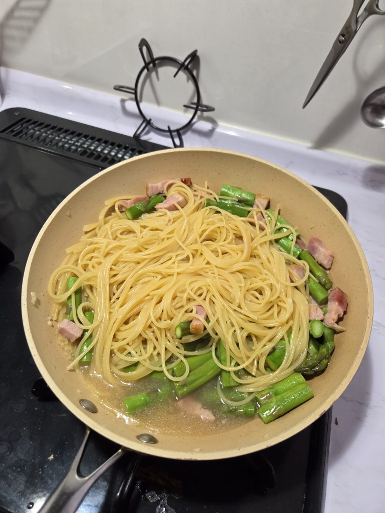 我が家のレシピシリーズ。今回はアスパラとベーコンのクリームパスタです。