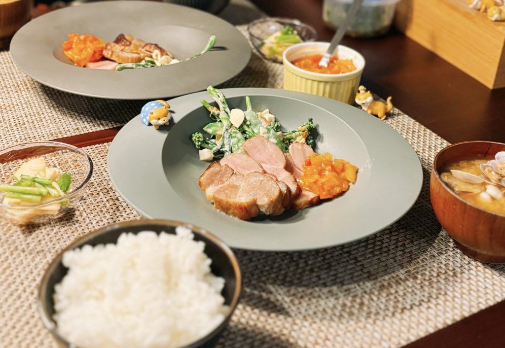 塩豚は塩と砂糖を振った豚肩ロースを3日ほど冷蔵庫で寝かせたものです。味もしっかりついていて満足感のあるおかずになります。