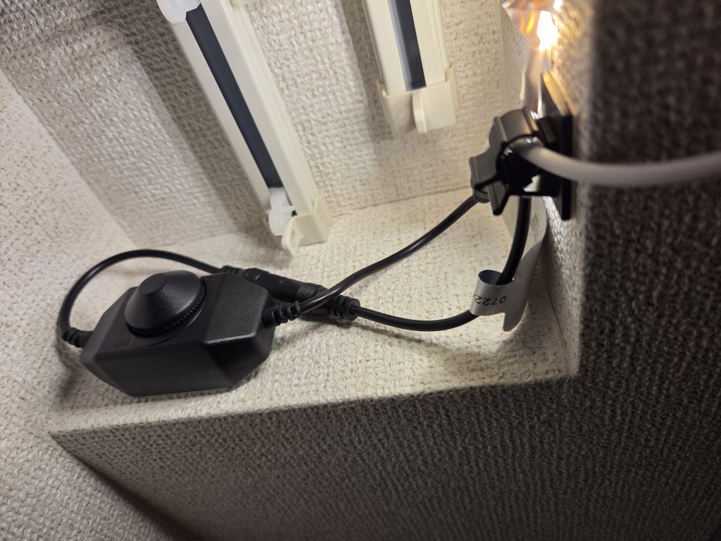テレビ台とかベッド下に使用するなら電源も隠しやすいと思うのですが、いかんせん天井付近に貼るのでちょっと工夫が要りそうです。