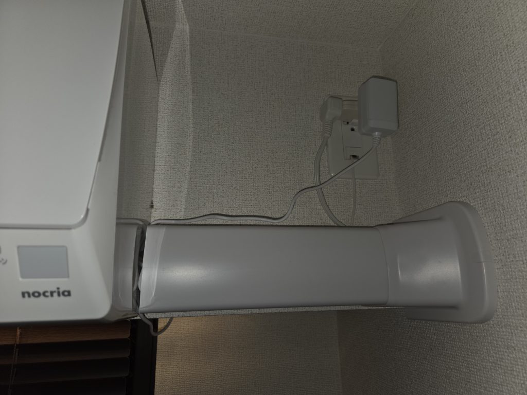 電源はコンセントから直接給電するタイプです。コンセントが近くにないとケーブルがみっともない感じになるので貼る場所は選びますが今回はすぐ上にエアコン用のコンセントがあり、余った配線もエアコン用のダクトの中に隠せるので問題なしと判断しました。