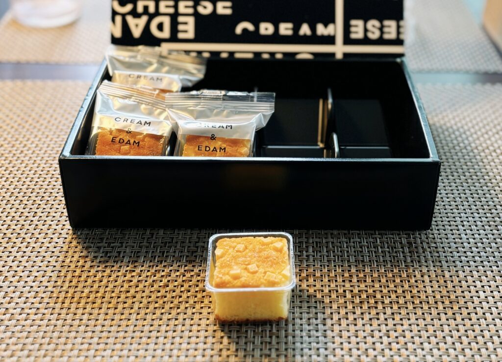 こちらは今回初めてもらったお土産でCREAM&EDAMと言います。販売元の[SNOW]CHEESEは2022年から販売開始した比較的新しい会社です。チーズ作りの専門家をスーパーバイザーに迎えて開発しているこだわりのチーズを使ったお菓子を販売していて、平日でも午前で完売するほどの人気だそうです。うちのおかんよくこんなの買えたな…
