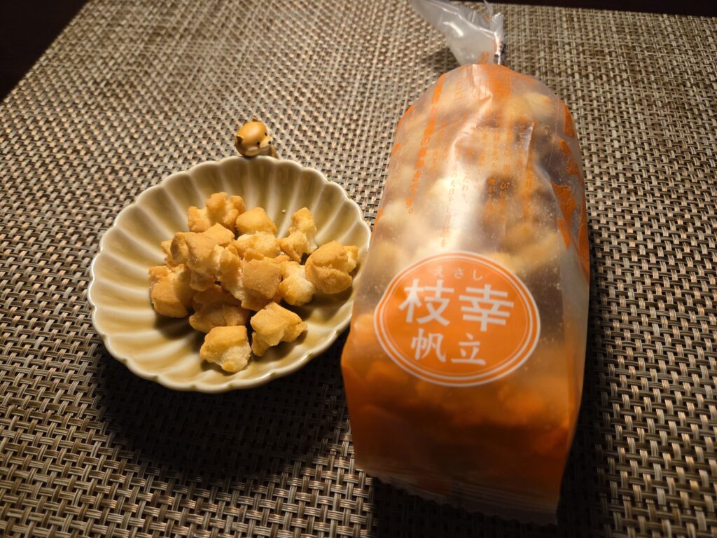 このおかきのポイントは各味ごとに違った乾燥魚介のおつまみが混ぜ込まれていることです。海の幸の旨味がぎゅぎゅっとつまったおつまみはここでは味変的存在なんですが主役を張れるレベルの贅沢な一品です。