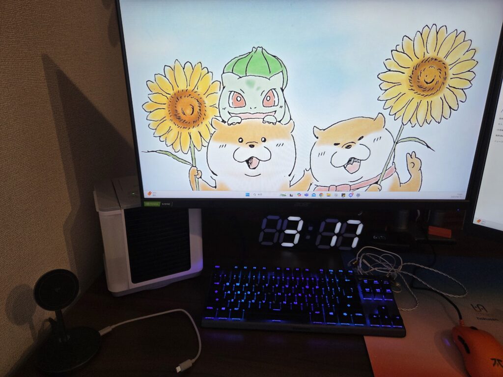 モニタの裏から送風したいのでモニターアームで画面の高さをちょっと上げました。