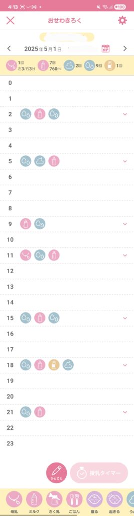 まずはお世話記録についてですが、写真はとある日の記録の例です。アイコンをタップすると詳細な時間や挙げたミルクの量などを確認できます。
